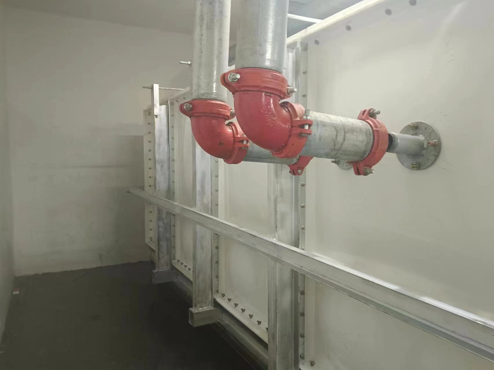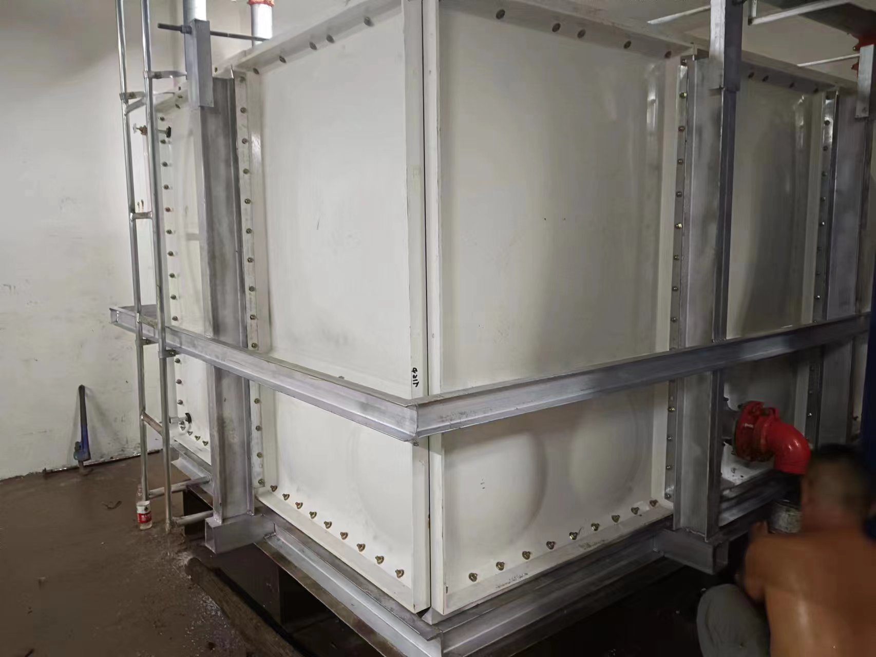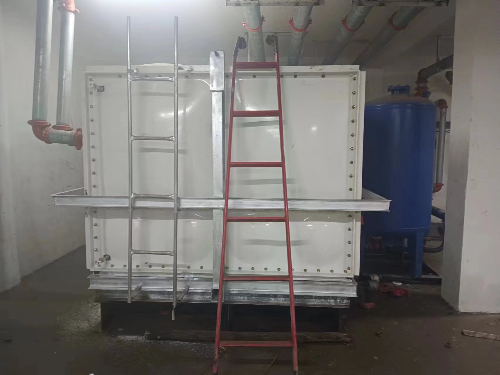 由于使用環(huán)境及使用介質(zhì)所限,有些水箱內(nèi)部盛有高濃度溶液,如:濃鹽水、海水等,對(duì)水箱內(nèi)壁鋼板會(huì)有嚴(yán)重腐蝕,因此無法采用不銹鋼水箱或者鋼板水箱。正常玻璃鋼水箱板可以耐腐蝕,但是水箱內(nèi)部又設(shè)有鋼制拉筋支撐等,故此也不適用以上介質(zhì)使用。為了滿足特殊用戶的使用需求,經(jīng)過承重及承壓測試后,這種無內(nèi)件玻璃鋼水箱面世,它采用不同規(guī)格(1000*1000mm、1000*500mm、500*500mm)的玻璃鋼模壓板組裝,水箱內(nèi)部沒有設(shè)任何鋼制配件,水箱外部及底部采用工字鋼加固,所有法蘭采用ABS材質(zhì)俗稱塑料材質(zhì),外觀整潔無變形,內(nèi)部無配件,易清洗、維護(hù)方便,延長了水箱的使用壽命,滿足特殊用戶的特殊需求。