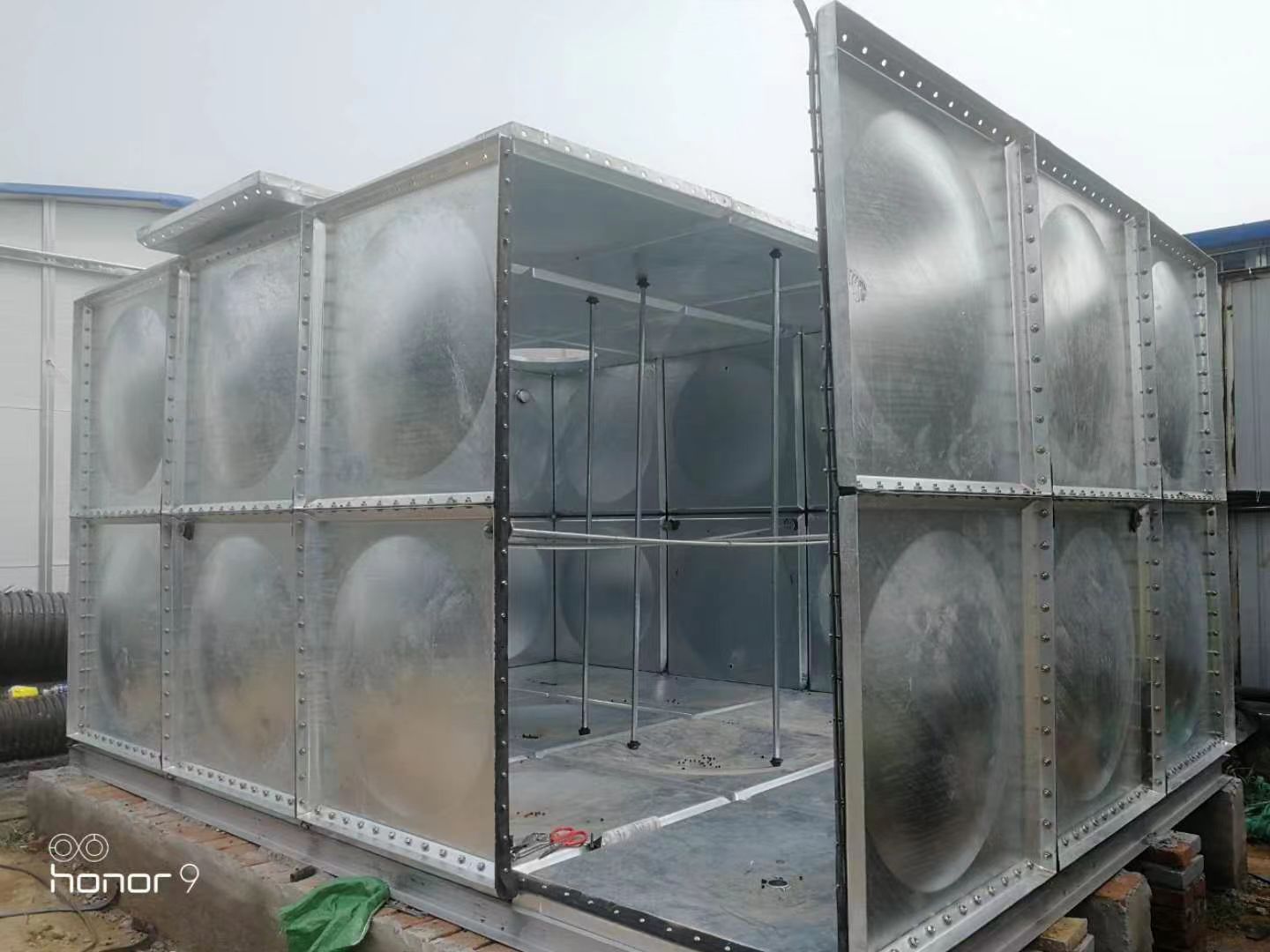 2.安裝的時候組合板之間要加好橡膠條,底板組裝完畢后在進焊好的底座上。整個水箱外層組裝好以后,支撐要穩固,拉筋要均勻。以保障正常使用。